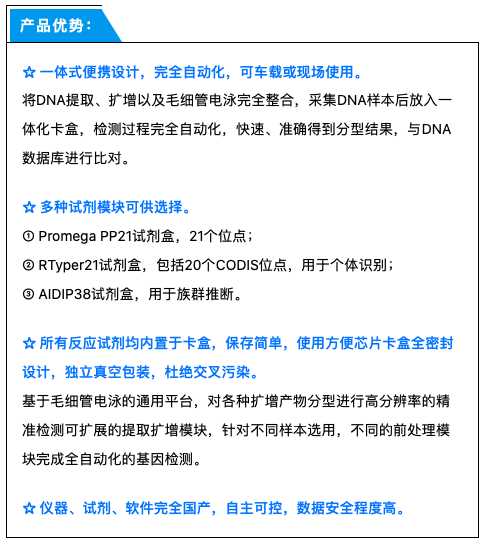 該系統(tǒng)基于微流控芯片技術(shù),配套全集成芯片卡盒和數(shù)據(jù)分析軟件,集DNA提取、PCR擴(kuò)增、毛細(xì)管電泳于一體,自動(dòng)生成分型結(jié)果,2小時(shí)即可獲得DNA分型。既可用于重大事故、自然災(zāi)害的人員身份快速識(shí)別和案件現(xiàn)場(chǎng)檢材的快檢快篩,也可用于邊防、公安等基層機(jī)關(guān)對(duì)敏感、可疑人員身份的快速識(shí)別和排查。儀器操作簡(jiǎn)單便捷,無(wú)需專(zhuān)業(yè)技術(shù)人員操作,可檢測(cè)的樣本包括:血卡、唾液卡、口腔拭子卡等。無(wú)使用環(huán)境要求,既可在實(shí)驗(yàn)室、辦公室、窗口單位,也可與警用現(xiàn)勘車(chē)配套移動(dòng)式檢測(cè),具有良好的抗震性、防污染措施,使用無(wú)需校準(zhǔn)。同時(shí)兼容多款國(guó)內(nèi)外DNA試劑,具備個(gè)體識(shí)別和族群推斷功能。