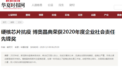 博奧晶典榮獲“2020年度企業(yè)社會責任先鋒獎”