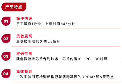 基于全新一代先進(jìn)的芯片實(shí)驗(yàn)室(Lab-on-a-chip)設(shè)計理念,化繁為簡,檢測時僅需將樣本保存液加入芯片,封閉芯片后即可上機(jī),手工操作小于1分鐘。生物反應(yīng)全程(包括核酸提取、核酸純化、擴(kuò)增反應(yīng)、核酸檢測和結(jié)果判讀等)均集成在一個整體密閉、內(nèi)部分區(qū)的微流控芯片內(nèi),由全自動核酸分析儀完成,因此無需專業(yè)分區(qū)實(shí)驗(yàn)室,無需人工干預(yù),最大程度降低操作人員感染及樣本間交叉污染的風(fēng)險。45分鐘完成實(shí)驗(yàn)全過程,最快可在35分鐘內(nèi)檢出新冠陽性樣本,檢測靈敏度可達(dá)150拷貝/毫升,在截至目前國內(nèi)獲批的同類產(chǎn)品中靈敏度最高,真正實(shí)現(xiàn)“樣本進(jìn)-結(jié)果出”。