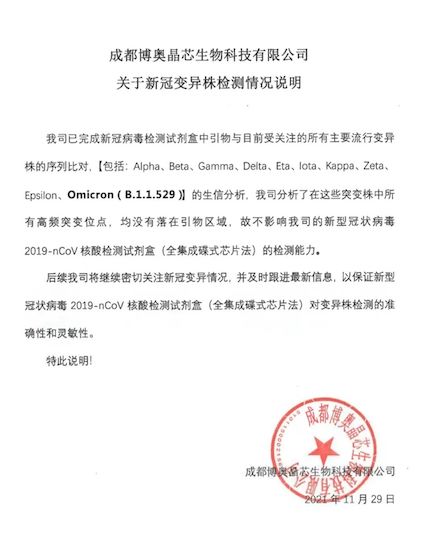目前,旗下成都博奧晶芯生物科技有限公司已完成新冠病毒檢測試劑盒中引物與目前主要流行變異株的序列比對【包括但不限于:Alpha、Beta、Gamma、Delta、Eta、Iota、Kappa、Zeta、Epsilon、Omicron(B.1.1.529)】,結(jié)果證實(shí):博奧晶典已上市的新型冠狀病毒2019-nCoV核酸檢測試劑盒(全集成碟式芯片法),不會出現(xiàn)脫靶和漏檢的情況。后續(xù),博奧晶典將持續(xù)緊密追蹤全球新冠病毒變異株的最新動態(tài)并及時跟進(jìn)最新信息,確保全集成新冠病毒核酸檢測芯片試劑盒對變異株檢測的準(zhǔn)確性和靈敏性。