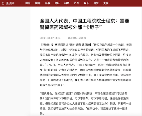 “伊拉克戰(zhàn)爭就是一個教訓(xùn),美國與伊拉克開戰(zhàn)時,對整個伊拉克實行全面禁運,任何國家的飛機都飛不進(jìn)去,美國雖然聲稱這樣做針對的是伊拉克軍隊,但卻殃及普通伊拉克百姓,許多病人因此沒有了救命的藥和醫(yī)療器械該怎么辦?這是一個值得思考和警惕的問題?!?月7日,全國人大代表,中國工程院院士、醫(yī)學(xué)生物物理學(xué)家程京在接受《環(huán)球時報》記者采訪時表示,國家應(yīng)該科學(xué)地謀劃中醫(yī)藥的發(fā)展,鼓勵其他學(xué)科的力量加入到中醫(yī)藥的交叉創(chuàng)新中來,真正實現(xiàn)中西醫(yī)并重,這樣即便有朝一日真的遭遇外部封鎖,我們也不會在事關(guān)人民健康和生命安全的醫(yī)藥領(lǐng)域被外部卡住“脖子”。