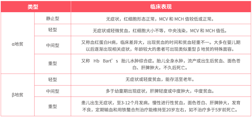 地中海貧血(簡稱”地貧”),是由于遺傳基因發(fā)生缺陷,導致紅細胞血紅蛋白合成異常,紅細胞容易破裂,壽命縮短,引起溶血性貧血,是我國南方常見和危害較大的遺傳病之一。常見的地貧類型:α-地貧和β-地貧。根據(jù)病情的輕重,又可分為:重型、中間型、輕型、靜止型。
