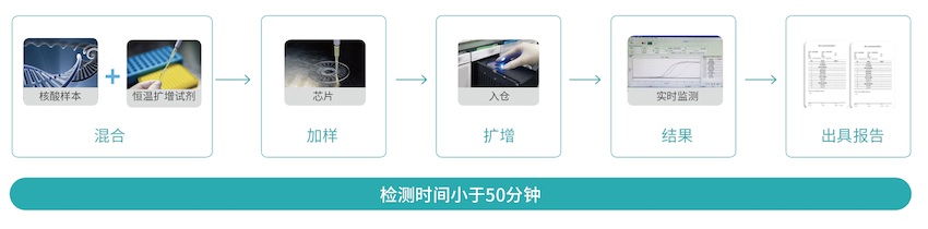 本試劑盒采用恒溫擴增技術(shù),利用具有鏈置換功能的聚合酶在恒溫(65°C)條件下進行反應(yīng),無需高溫變性和低溫退火過程,不存在溫度變化引起的時間損耗,因此擴增速度非???,可以在很短時間內(nèi)(47分鐘)完成靶核酸擴增,然后利用熒光染料摻入法進行實時熒光檢測,擴增陽性的樣品會產(chǎn)生“S”形擴增曲線,一步完成對靶基因的擴增和檢測。