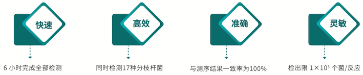采用生物芯片技術(shù)將序列已知的寡聚核苷酸探針分子固定于芯片基片,然后與待檢標(biāo)本中標(biāo)記的核酸進(jìn)行分子雜交,通過檢測(cè)每個(gè)探針分子的雜交信號(hào)強(qiáng)度,對(duì)17種臨床常見分枝桿菌進(jìn)行快速鑒定,從而準(zhǔn)確鎖定致病菌種類型。該試劑盒是國(guó)內(nèi)第一批獲得CFDA認(rèn)證的分枝桿菌快速菌種鑒定產(chǎn)品。