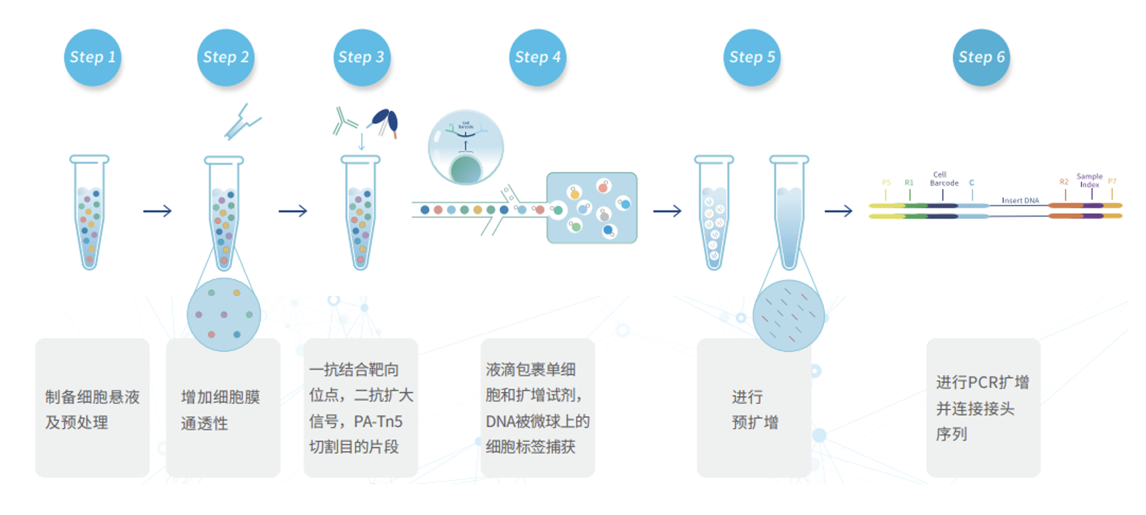 本試劑盒通過抗體和 Tn5 酶識別蛋白與 DNA 的結合位點,并靶向切割 DNA 分子。基于液滴微流控技術將經(jīng)過處理的單個細胞包裹形成油包水結構,并借助帶有細胞標簽的微球捕獲 DNà 片段和標記 DNA 分子,實現(xiàn)蛋白與 DNA 位點結合的測序,具有高通量、超高分辨率、超強特異性的特點。目前提供的檢測抗體:可選5種組蛋白修飾:H3K27ac、H3K4me1、H3K4me3、H3K27me3、H3K36me3;1種DNA結合蛋白:Rpb1(RNA聚合酶 Ⅱ)