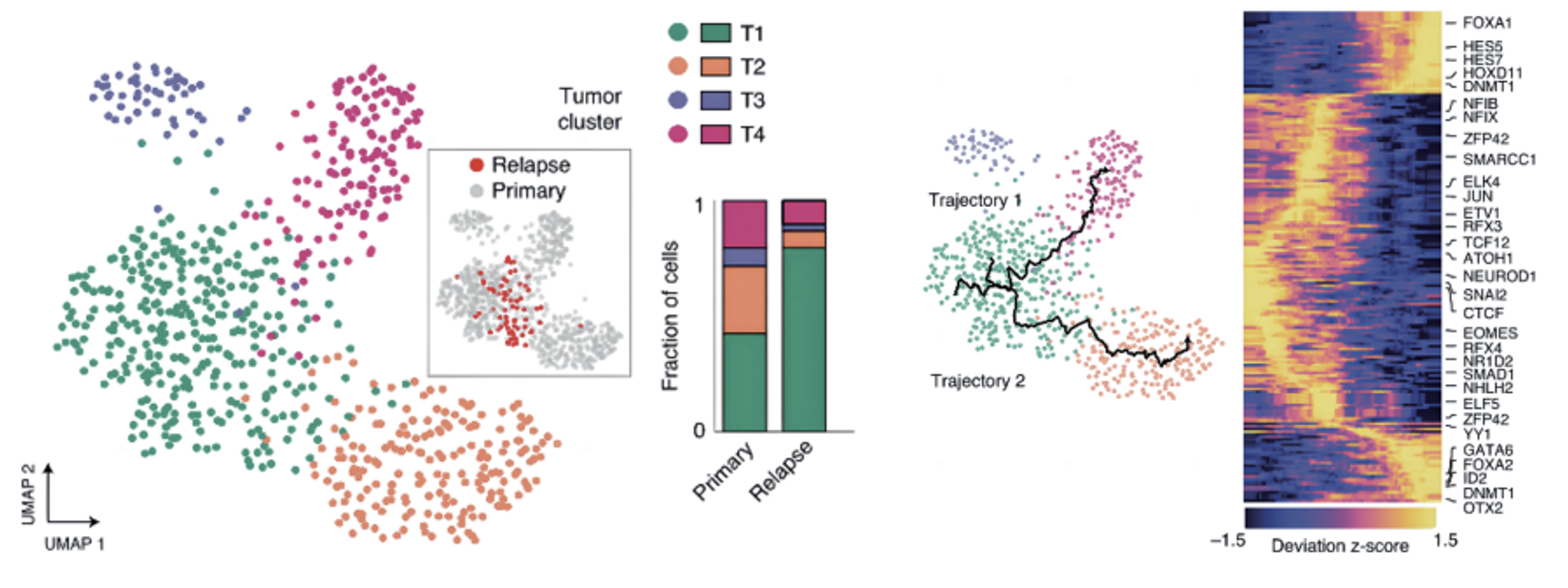 數(shù)據(jù)表明樣本共分為4類細胞亞群,其中復發(fā)腫瘤細胞T1亞群占比最高,該群細胞H3K27me3的信號弱并且細胞干性相關的基因活躍,具有向其他細胞類群發(fā)育的潛力。