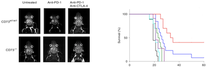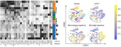 2019年12月,Nature Medicine發(fā)表對免疫檢查點治療效果好和不好的5種癌癥類型,共94例患者進(jìn)行單細(xì)胞蛋白和單細(xì)胞RNA測序,在多形性膠質(zhì)母細(xì)胞瘤中發(fā)現(xiàn)了一個獨特的CD73hi巨噬細(xì)胞群,在抗PD-1治療后仍然存在。通過構(gòu)建CD73敲除鼠發(fā)現(xiàn)CD73的缺失提高了抗CTLA-4和抗PD-1治療的多形性膠質(zhì)母細(xì)胞瘤小鼠模型的存活率。證實CD73是一種特異性的免疫治療靶點,可提高多形性膠質(zhì)母細(xì)胞瘤免疫檢查點治療的抗腫瘤免疫應(yīng)答。