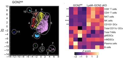 2019年12月,Science Immunology發(fā)表對黑色素瘤患者進(jìn)行單細(xì)胞蛋白和單細(xì)胞RNA測序,發(fā)現(xiàn)腫瘤微環(huán)境的變化:巨噬細(xì)胞和髓樣抑制細(xì)胞的促炎性活化的增加,腫瘤內(nèi)CD8+T細(xì)胞中的干擾素-γ表達(dá)。GCN2通過促進(jìn)轉(zhuǎn)錄因子CREB-2/Atf4的翻譯增加而改變了髓樣抑制細(xì)胞的功能,其中CREB-2/Atf4是小鼠和人類中巨噬細(xì)胞和髓樣抑制細(xì)胞成熟所必需的,而且利用小干擾RNA靶向Atf4可降低腫瘤生長,揭示免疫腫瘤學(xué)潛在的治療靶點GCN2在腫瘤免疫反應(yīng)中的作用。