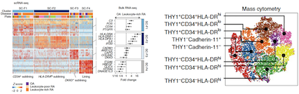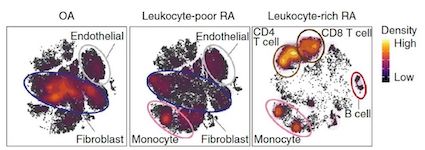 2019年5月,Nature Immunology報道關(guān)于類風(fēng)濕性關(guān)節(jié)炎(RA)的研究。作者對來自RA或骨關(guān)節(jié)炎(OA)患者的51個滑膜組織樣品的T細(xì)胞、B細(xì)胞、單核細(xì)胞和成纖維細(xì)胞進(jìn)行單細(xì)胞RNA測序(scRNA-seq)、質(zhì)譜流式檢測、 轉(zhuǎn)錄組測序(bulk RNA-seq)和普通流式細(xì)胞檢測。利用基于5,265個scRNA-seq圖譜典型相關(guān)分析的綜合策略,作者鑒定了18個獨特的細(xì)胞群。通過在單細(xì)胞層面對跨數(shù)據(jù)模態(tài)進(jìn)行整合,精確定義了特定細(xì)胞亞群在RA和慢性炎癥中的作用。