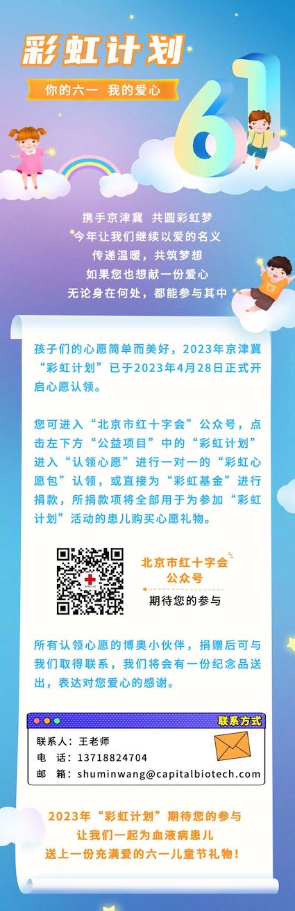為了更好地關(guān)心、關(guān)愛血液病患兒,使更多人了解和加入造血干細(xì)胞捐獻(xiàn)公益事業(yè),2009年中華骨髓庫和新京報聯(lián)合發(fā)起了“你的六一,我的愛心”公益活動,呼吁全社會關(guān)注血液病兒童,為他們送上小小的兒童節(jié)禮物,讓他們感受到來自陌生人的溫暖。此后的每一年,北京市紅十字會和志愿者把這個公益項目延續(xù)至今。2016年起,京津冀三地紅十字會、志愿者和愛心人士一起以“攜手京津冀、共圓彩虹夢”為主題,將這個項目發(fā)展、壯大。
